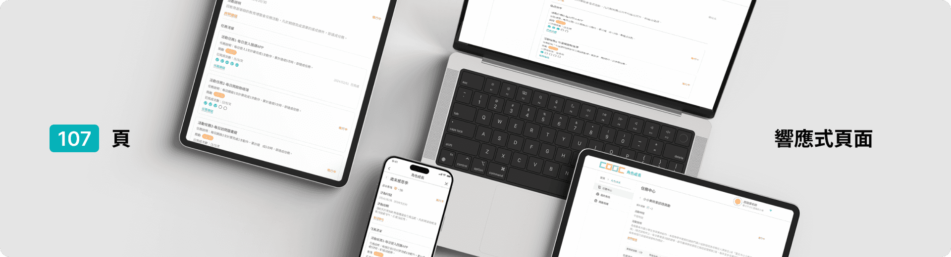 Web app形式開發,根據Boostrap的斷點框架,我設計了針對手機、平板與桌機共107個RWD畫面,確保在任何載具仍操作順暢。
