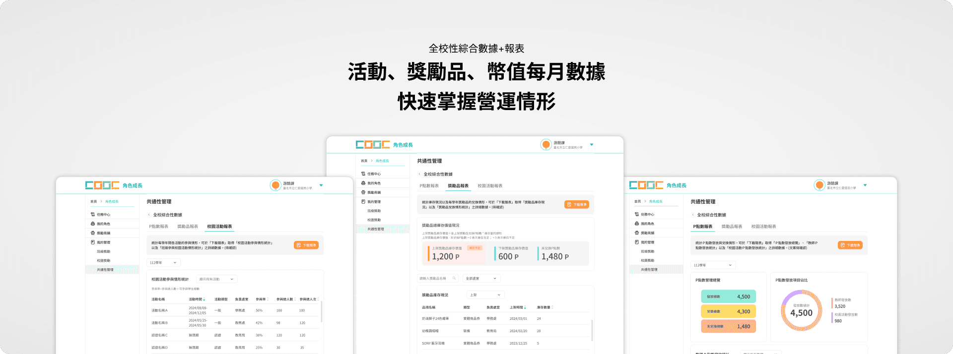 為了幫助校端的管理者一目了然的掌握營運概況,並調整政策,我們針對最重要的三大主題設計了簡易的數據追蹤頁面,以及相對應的報表。盡量在一幀內呈現報表的重點,並且提供警示功能,在數據達到危險值的時候提醒。