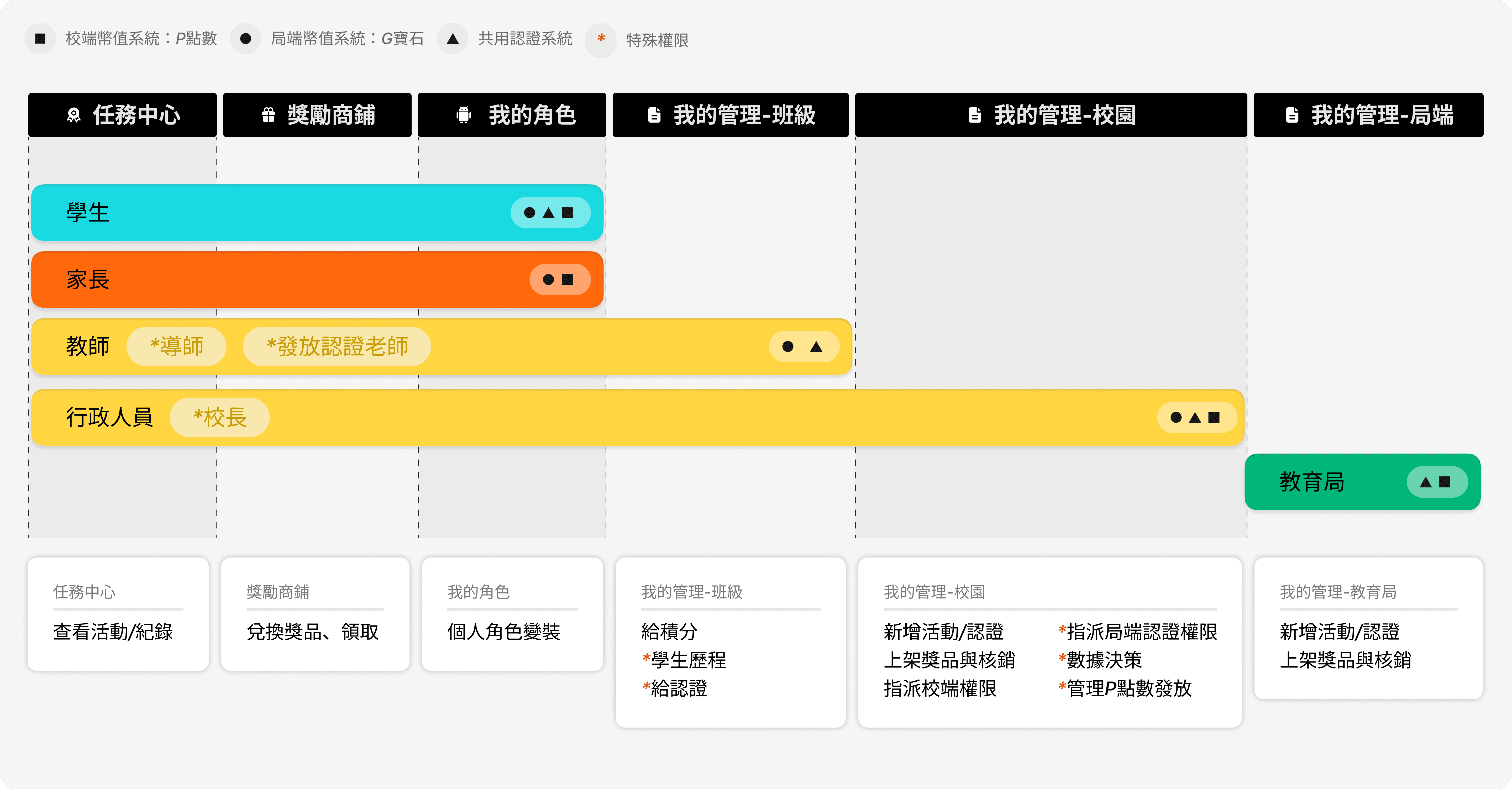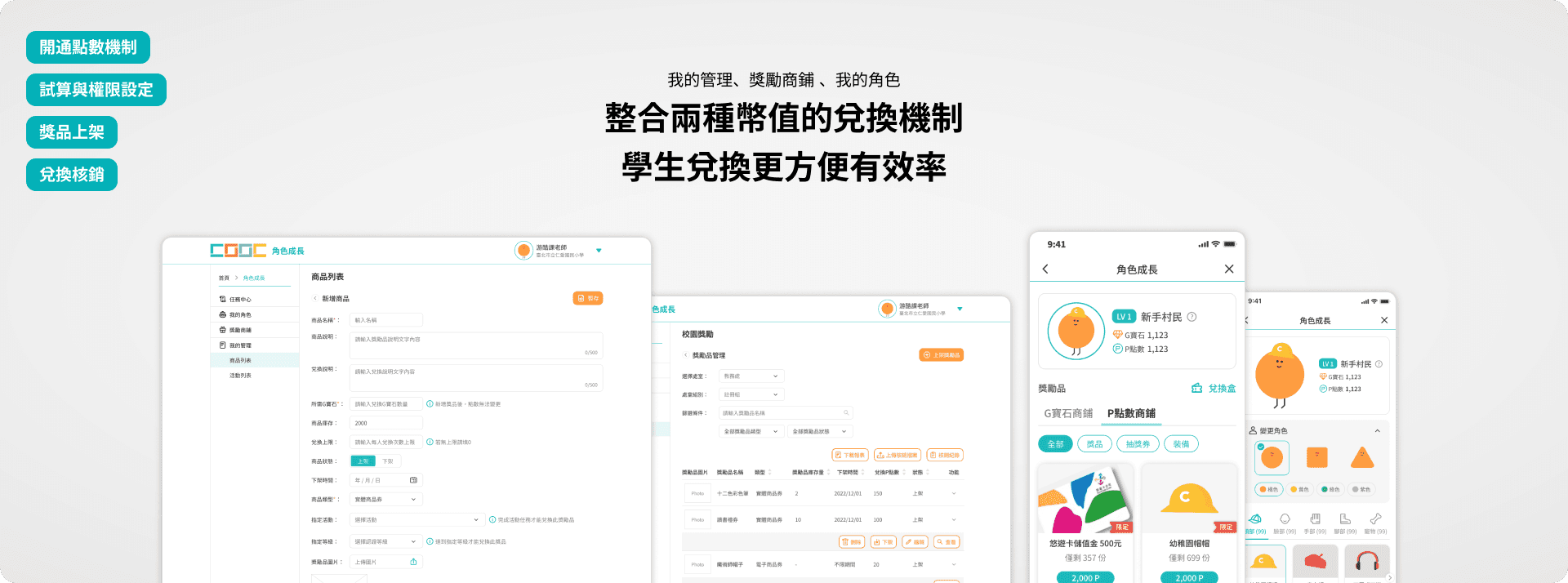 我們將幣值的獎勵融合至同一平台上,設計了完整的幣值獎勵管理/使用流程,確保兩種幣值對學生使用上都是容易、連貫的,對學校來說管理上也更輕鬆。