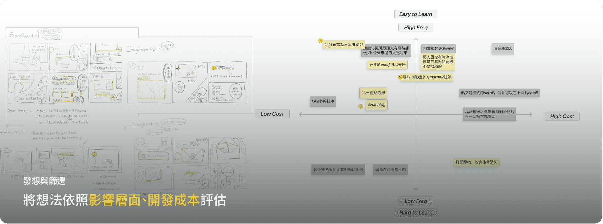 在這一階段的發想,我希望盡量以最小的變動達到最大的效益,因此基本上是建立於原先的資訊架構和畫面進行嘗試。在發想的點子中我根據影響層面(如使用頻率與學習成本)、技術門檻篩選出了幾個方向,並且以Storyboard, Wireframe 和 Sitemap梳理其體驗和資訊。