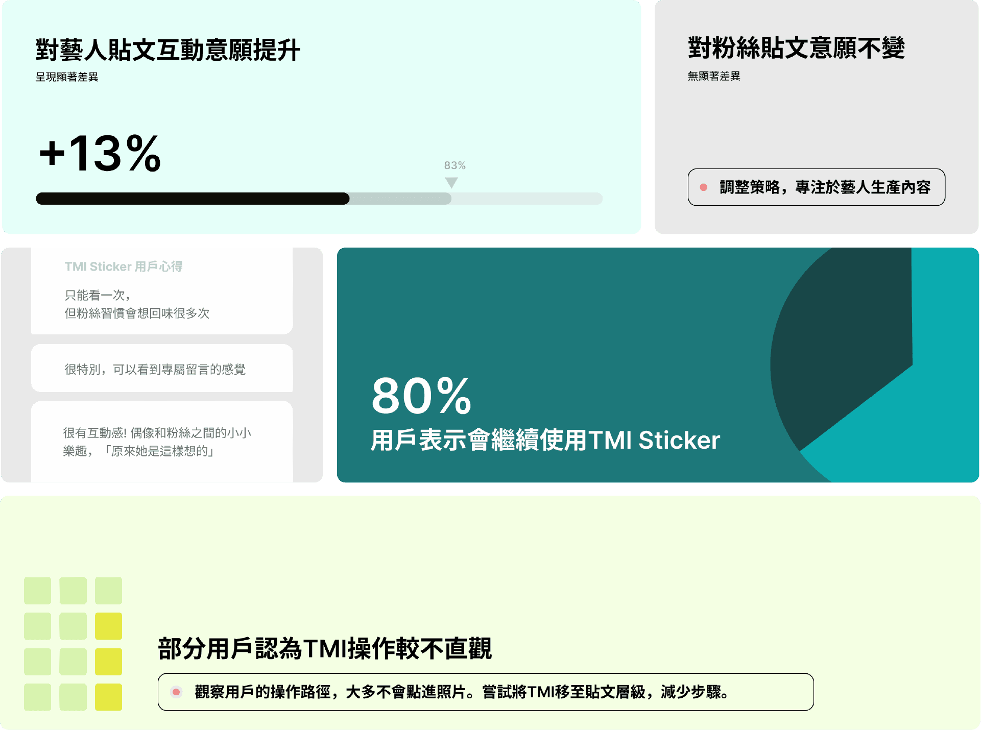 互動意願提升+13%,新互動TMI功能有80%受測者表示會想持續使用